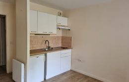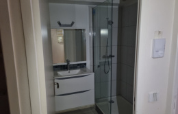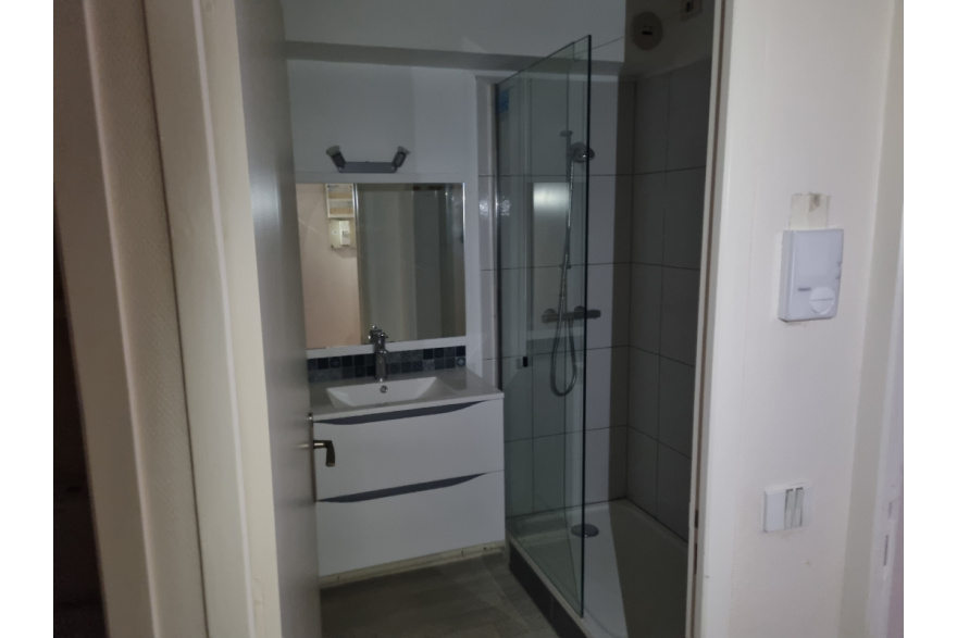 Cuisine équipée plaque de cuisson et réfrigérateur, pièce de vie avec grand placard coulissant, salle d'eau avec douche et wc séparé.